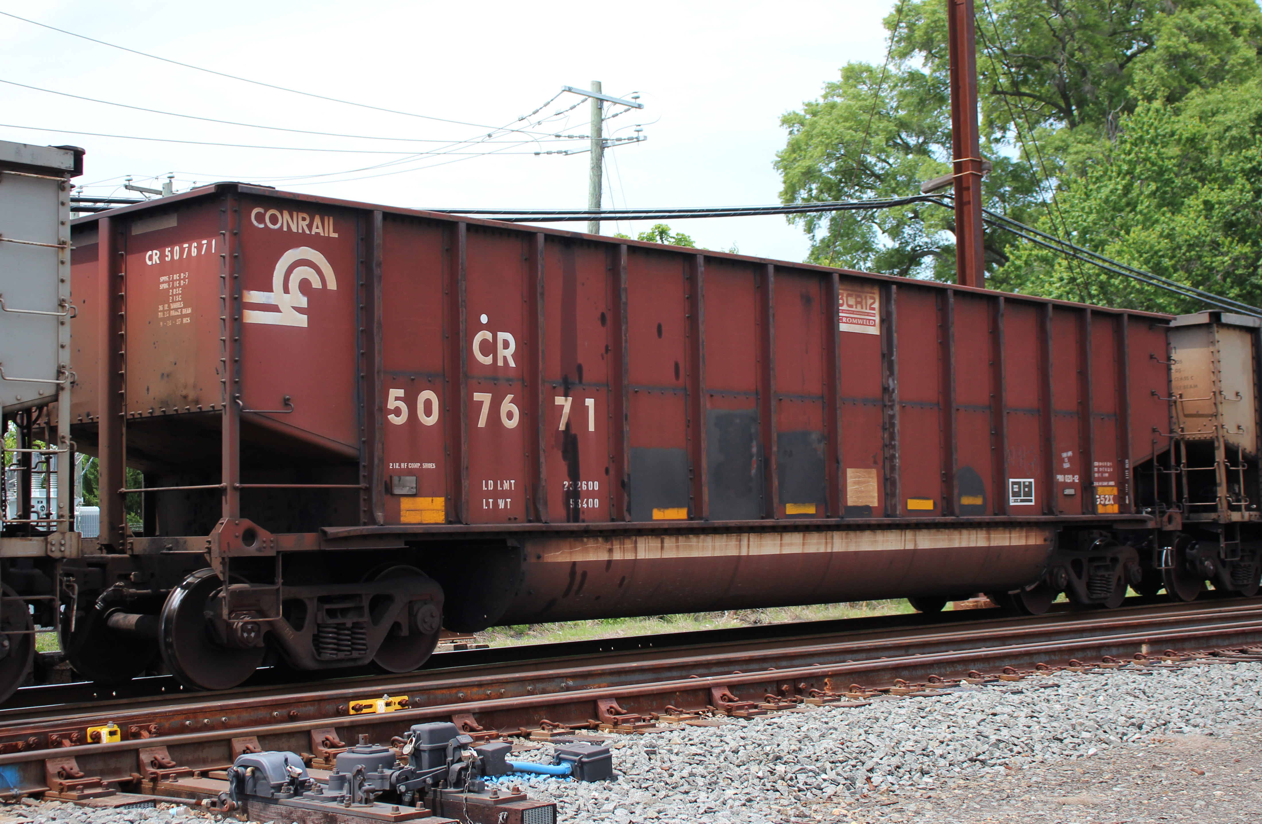 CR 507671 is seen in the consist of NS Y97 at Perryville, MD on 5/11/23. Car was built 9-97 (painted 9-24-97) by HCS.