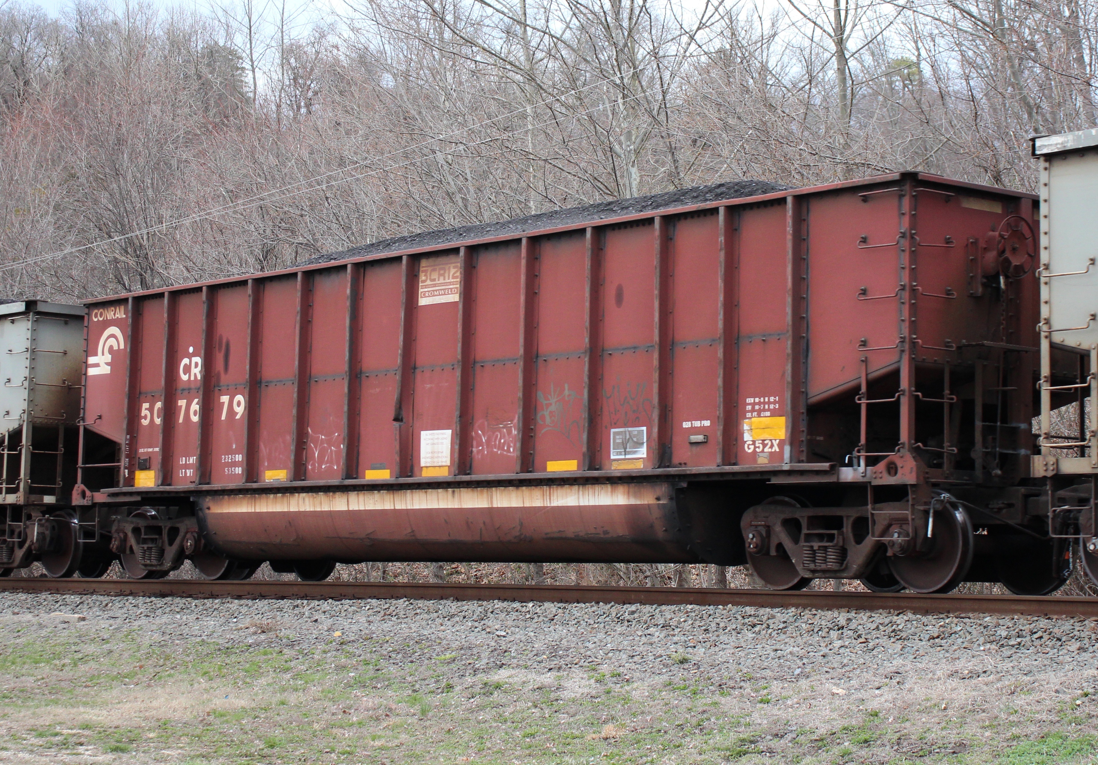 CR 507679 is seen in the consist of NS 590 at Port Deposit, MD on 3/22/25. Car was built 9-97 (painted 9-25-97) by HCS.