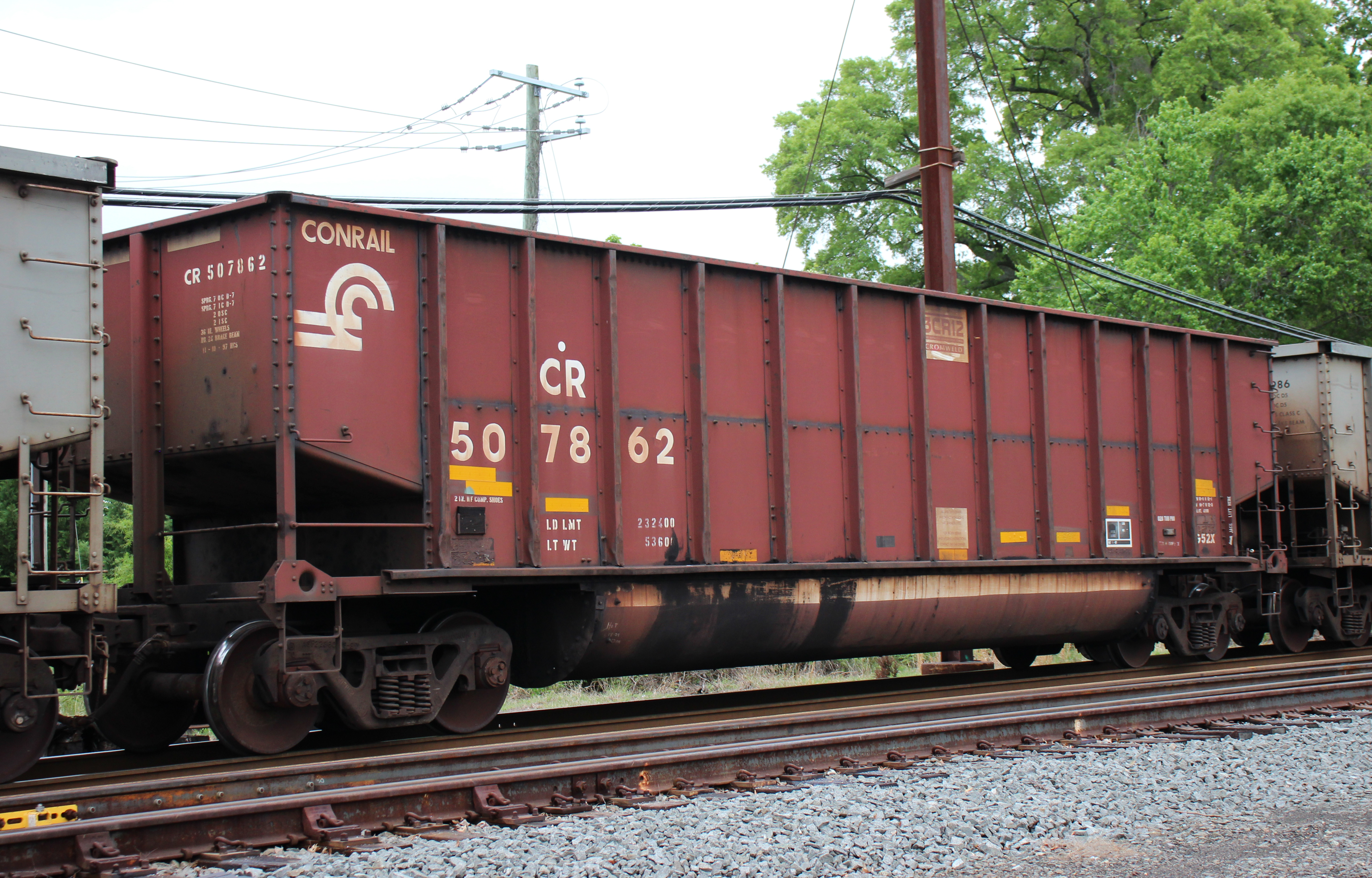 CR 507862 is seen in the consist of NS 591 at Perryville, MD on 5/4/25. Car was built 11-97 (painted 11-10-97) by HCS.