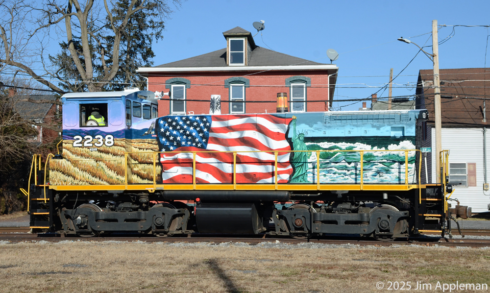 IU (Indianapolis Union Railway) 22 → CR 9600 → NS 2238 → NSHR 2238 SW1500 has become the North Shore Railroad's contribution to America's 250th birthday with this astounding hand-painted vision high-lighting America by Sunbury, PA artist Pedro Reyes. Each side depicts different symbols of our nation.