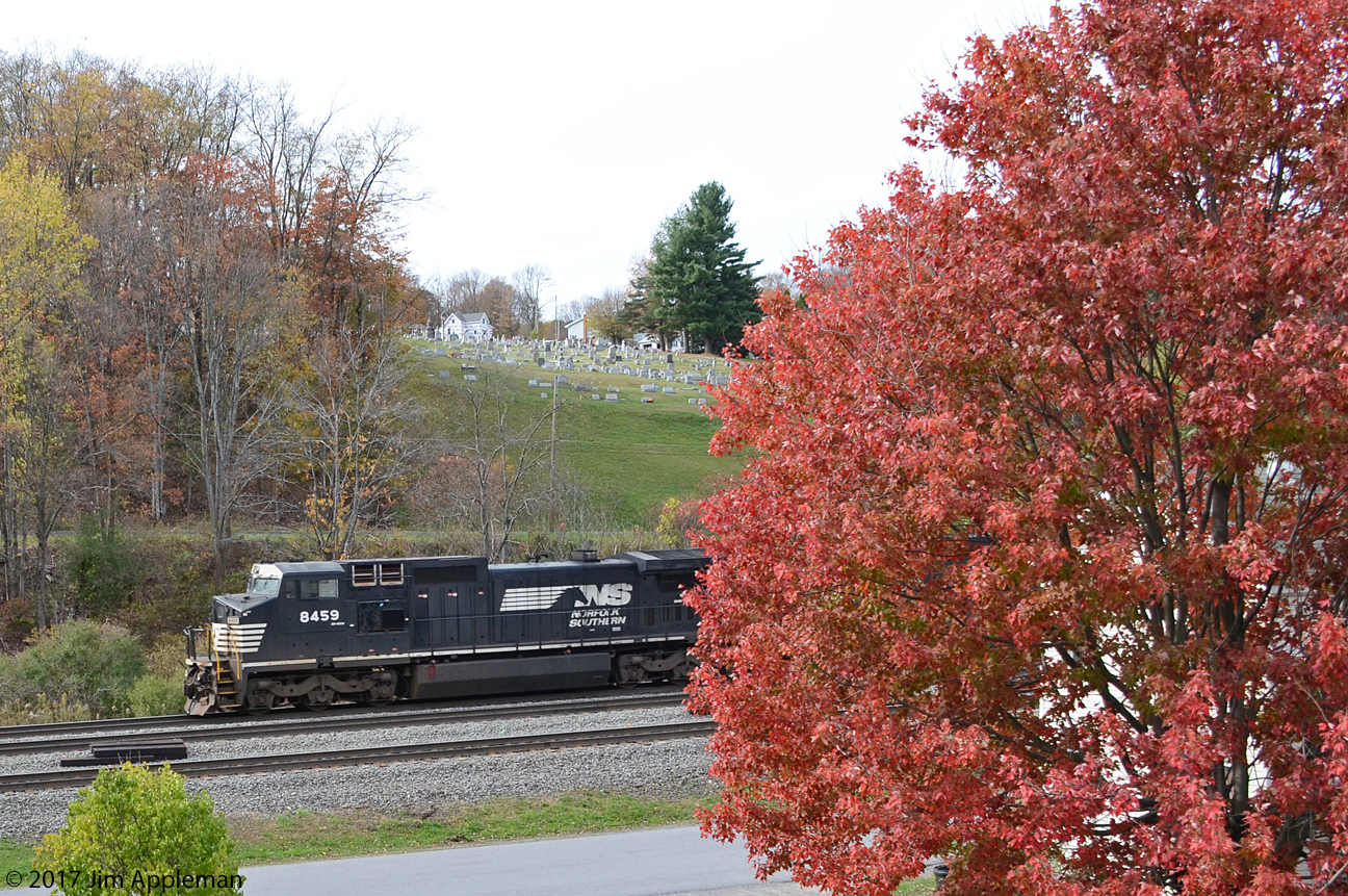 Ex-LMS 719 C40-8W (NS D8-40CW) leads a westbound freight in autumn's splendor.