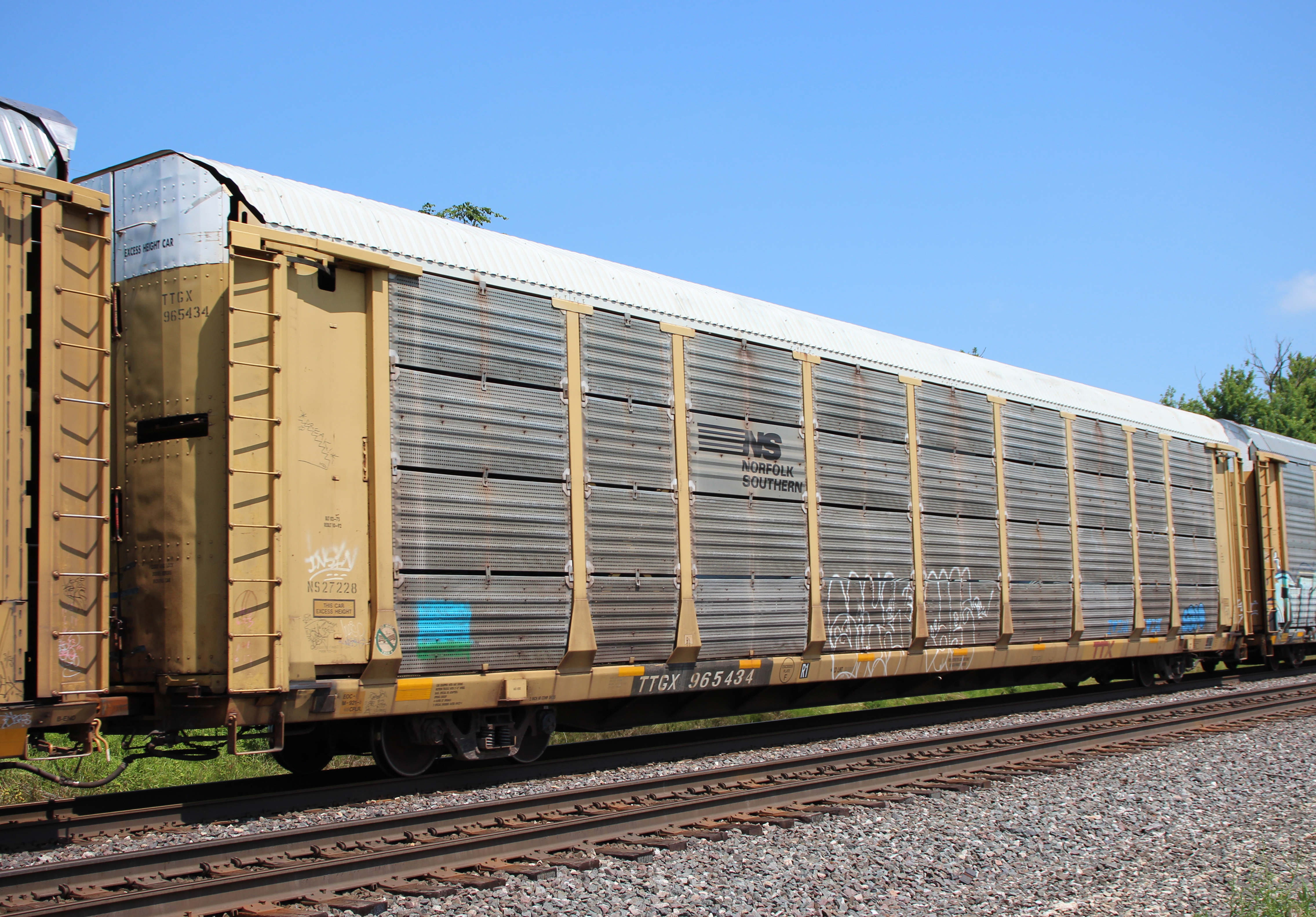 TTGX 965434 is seen in the consist of CSX M216-24 at Crestline, OH on 6/26/25. Rack was built as an unknown CR ML2L class rack in 10-92. It was then rebuilt, repainted, and renumbered to NS 27228 in 5-05 at PRDK. Rack is now classed FB551 by NS.