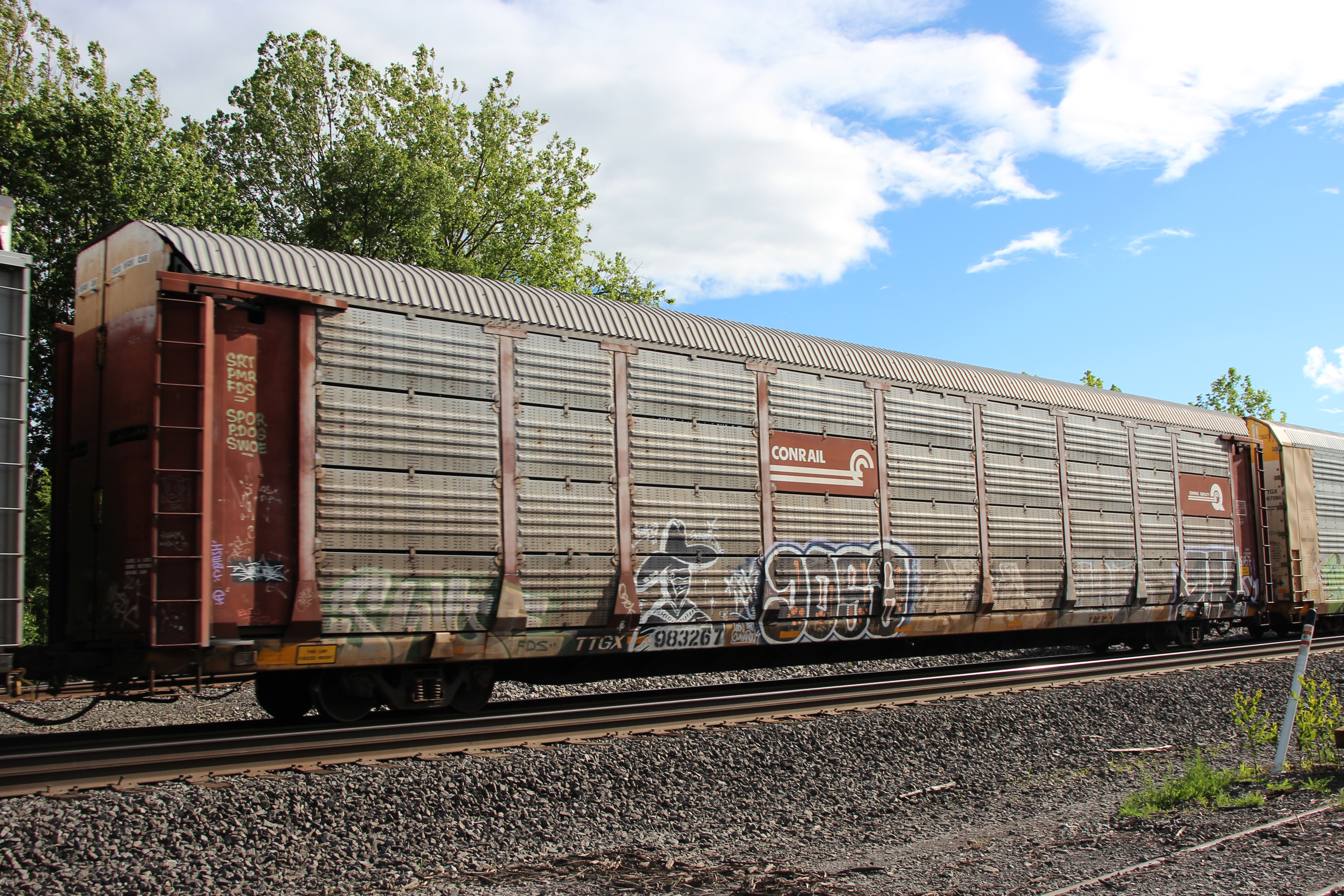 TTGX 983267 is seen in the consist of NS 11N at Sinking Spring, PA on 5/24/25. Rack number is CR 10429, built 7-95 and is now owned by NS.
