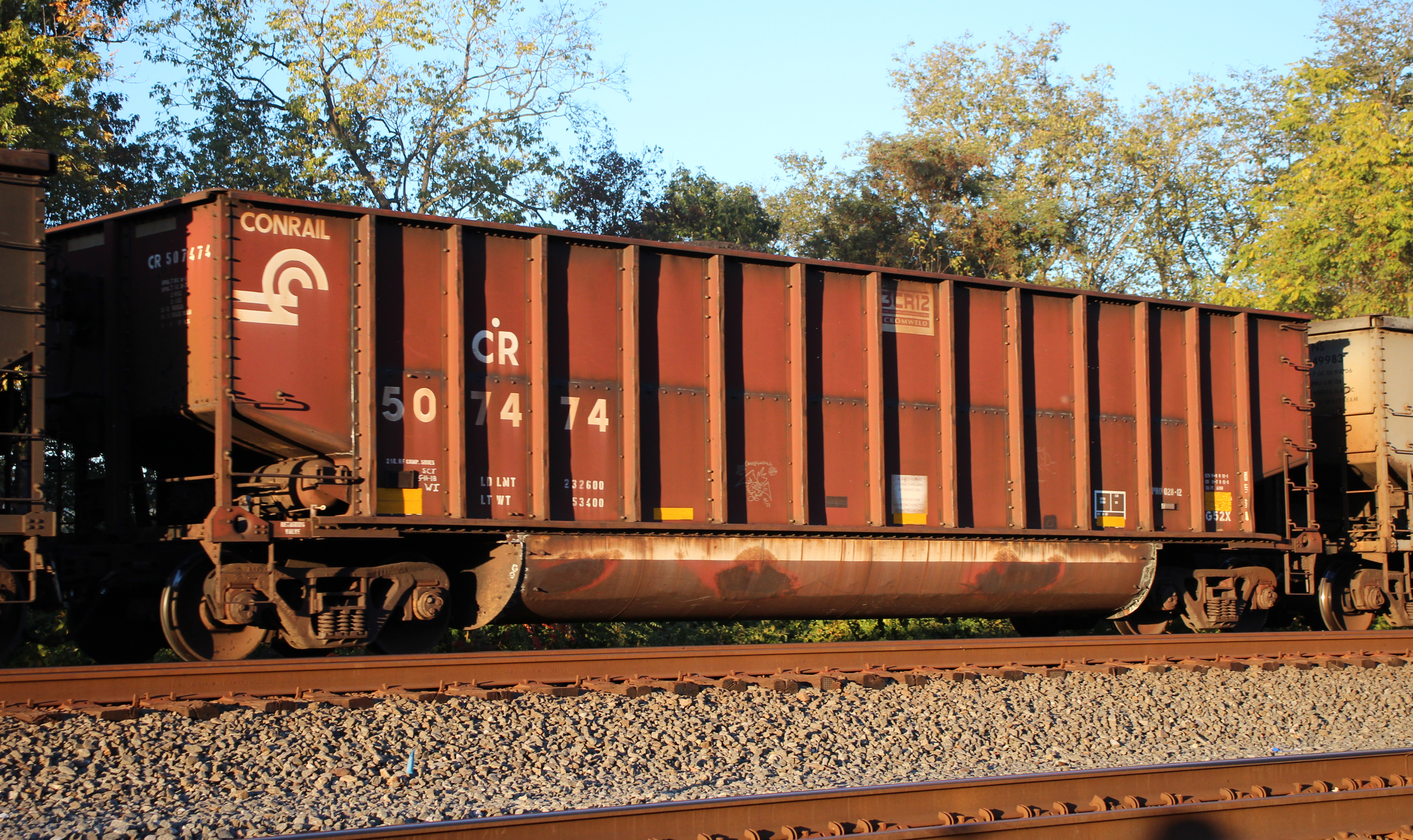 CR 507474 is seen in the consist of WB NS 632 at Cove, PA on 10/18/25. Car was built 8-97 (painted 8-9-97) by HCS.