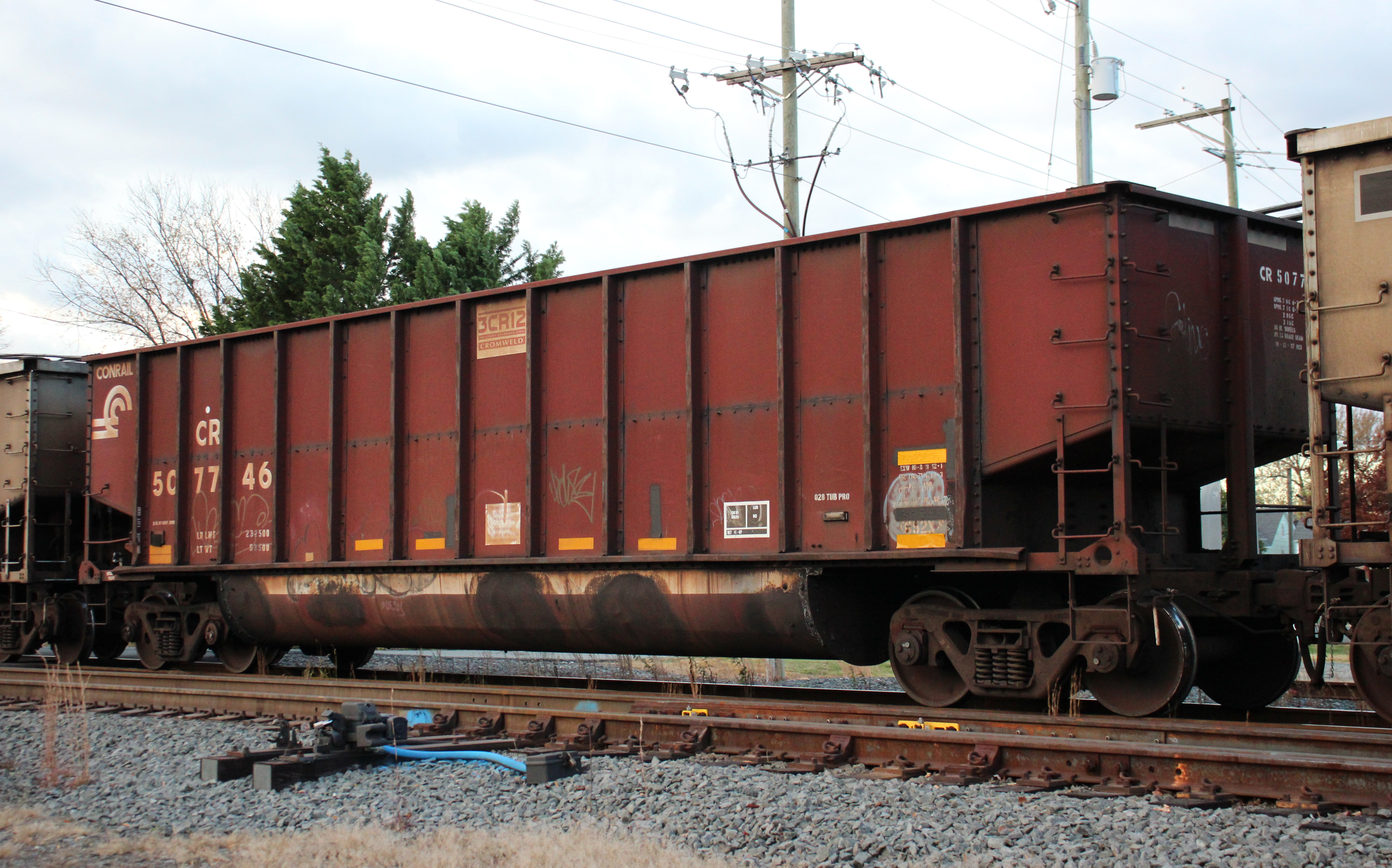 CR 507746 is seen in the consist of NS 597 at Perryville, MD on 11/16/25. Car was built 10-97 (painted 10-13-97) by HCS.