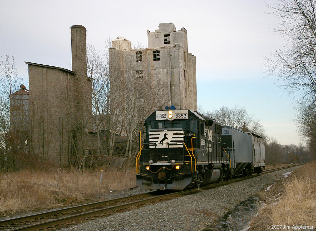 Ex-CR 8207 GP38-2 heads west on the NS Watsontown Secondary with H44 local past shut down Herr's Mill, which later underwent demolition, crashing down into a pile of rubble on March 26, 2011.