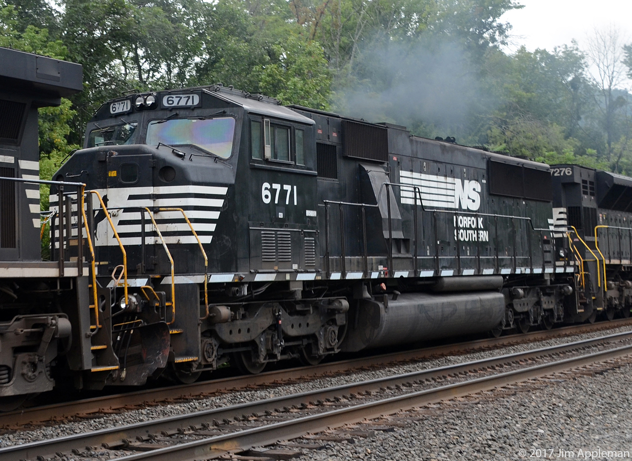 NS 6771 SD60M third unit of four powering an eastbound intermodal at track speed on the Pittsburgh Line east of Huntingdon, PA.