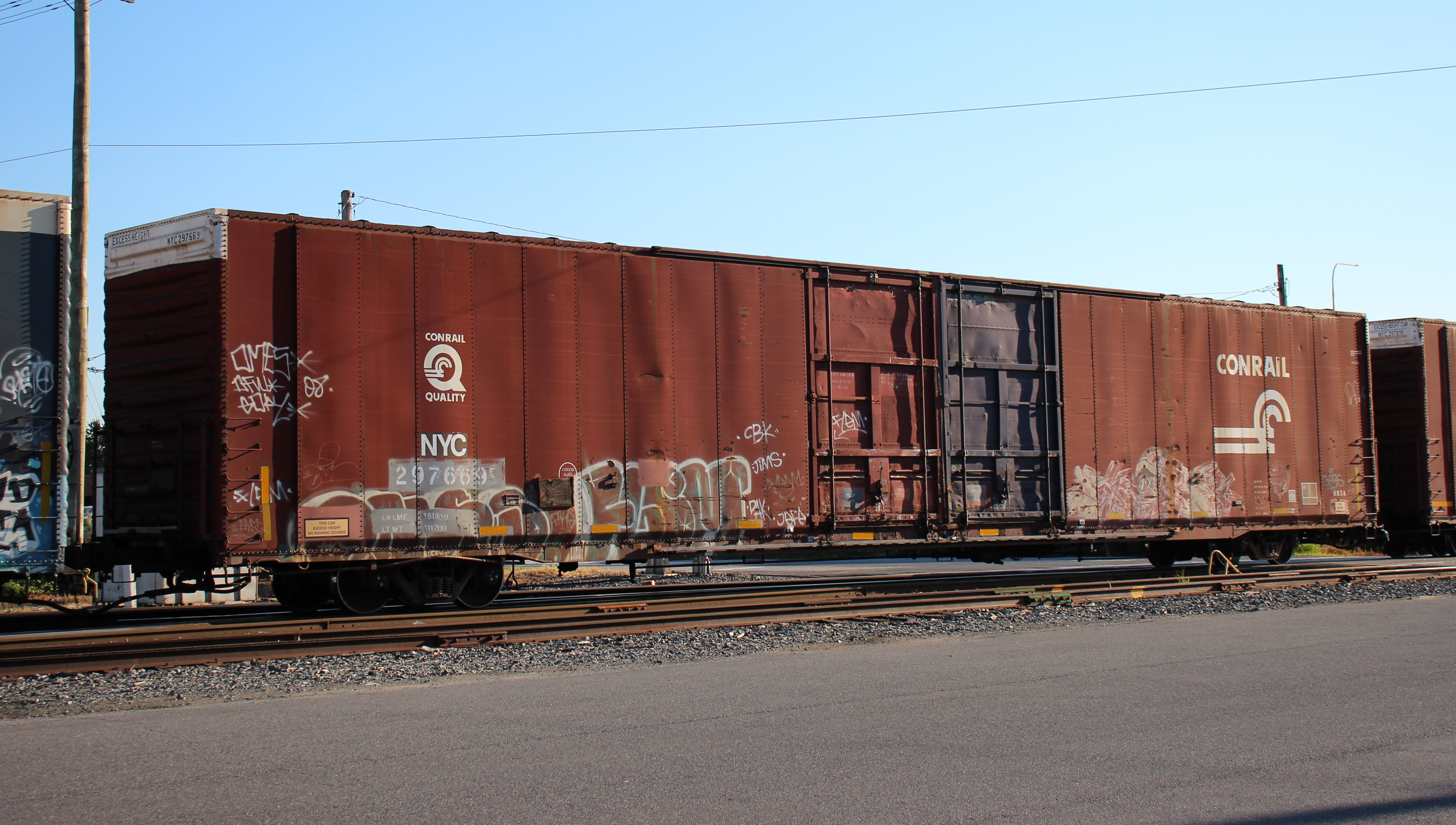 NYC 297669 is seen in the consist of CSX L125-22 at Elsmere, DE on 8/22/25. Car is ex CR 297669 and was built 4-78 by Greenville Steel Car.