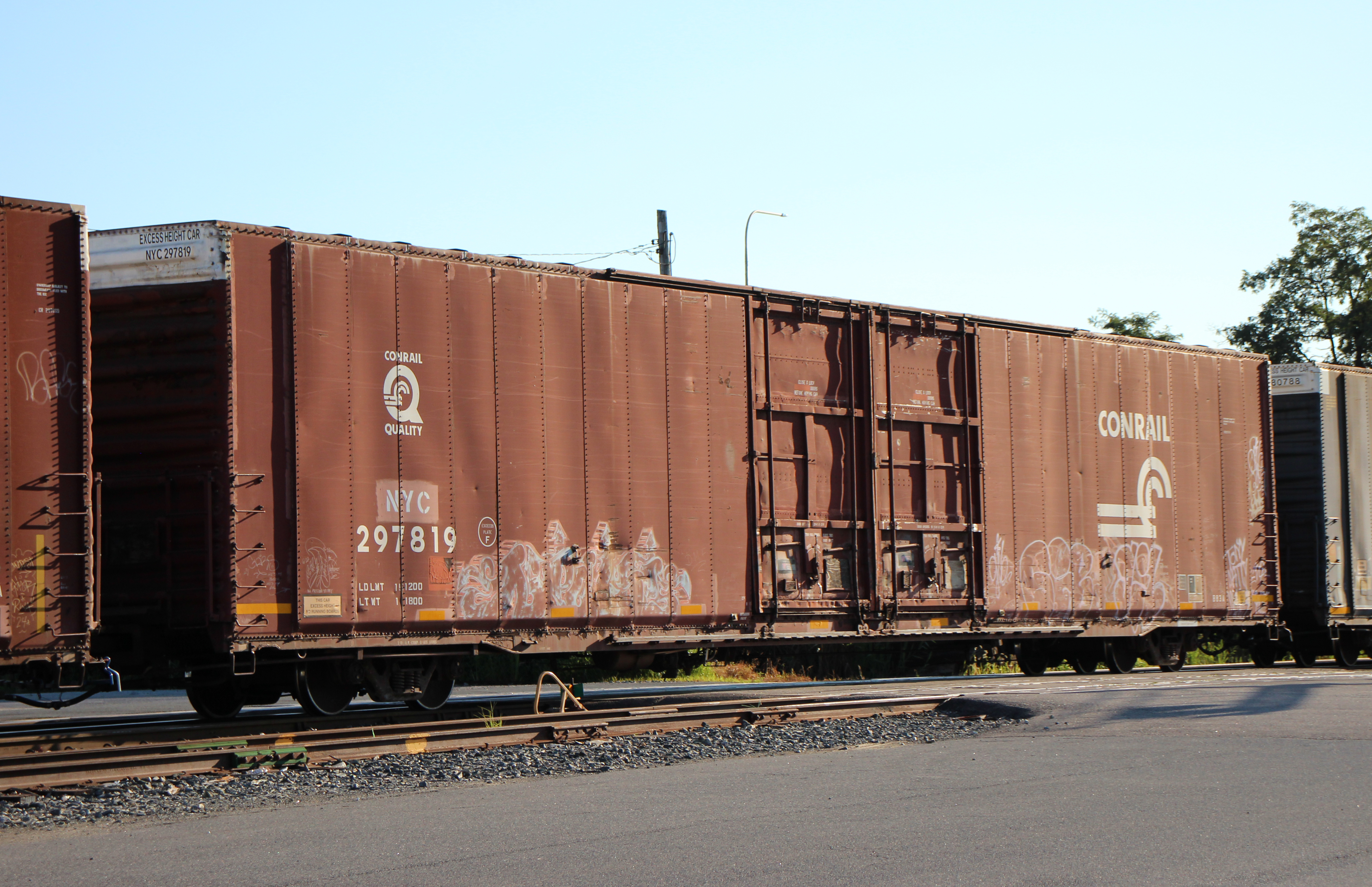 NYC 297819 is seen in the consist of CSX L125-22 at Elsmere, DE on 8/22/25. Car is ex CR 297819 and was built 5-78 by Greenville Steel Car.