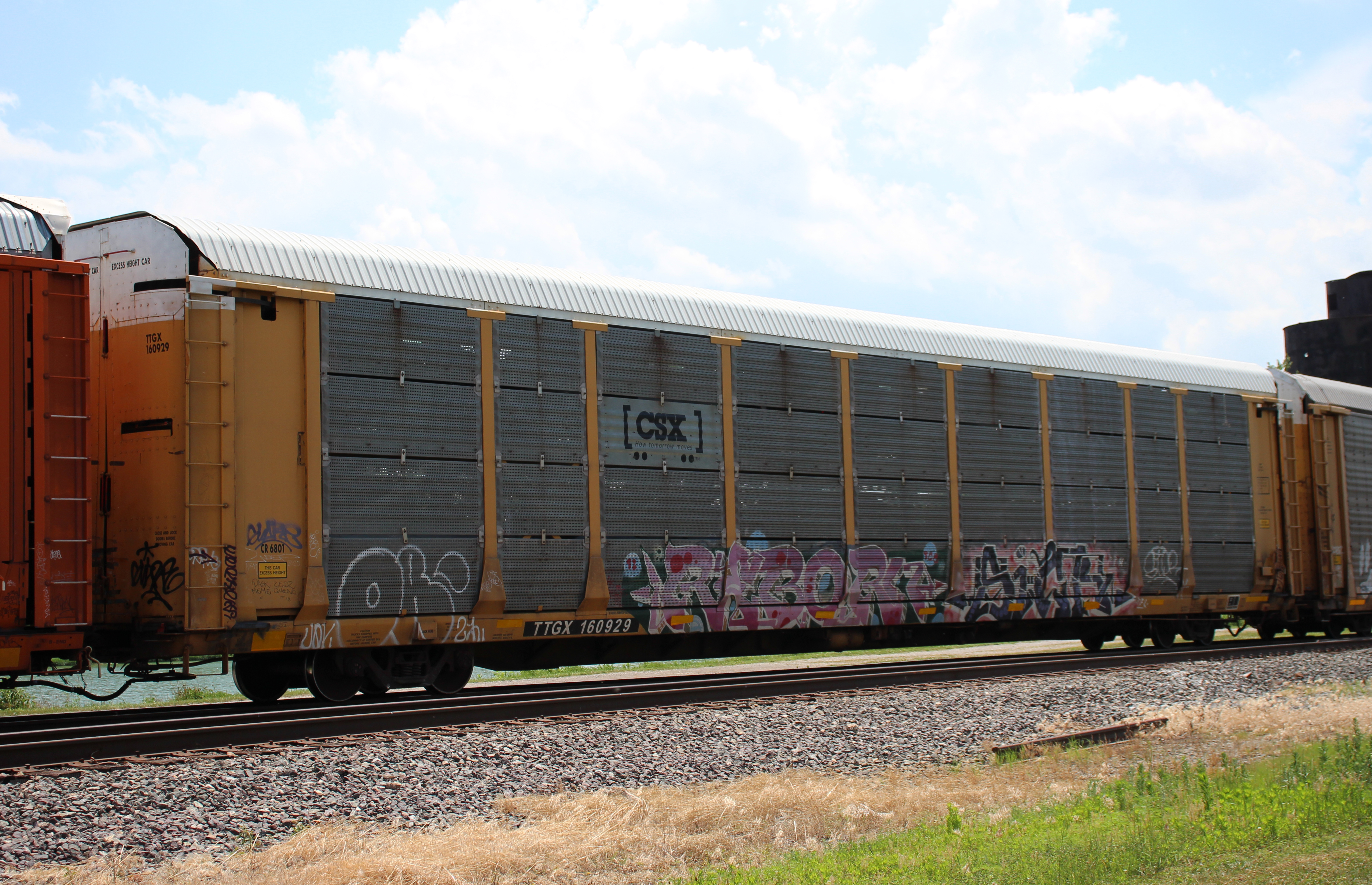 TTGX 160929 is seen in the consist of CSX M560-27 at Deshler, OH on 6/27/25. Rack number is CR 6801 and was built as a CR ML2G in 10-88. It was then rebuilt and repainted CSX in 10-14 at MEI ESTL.