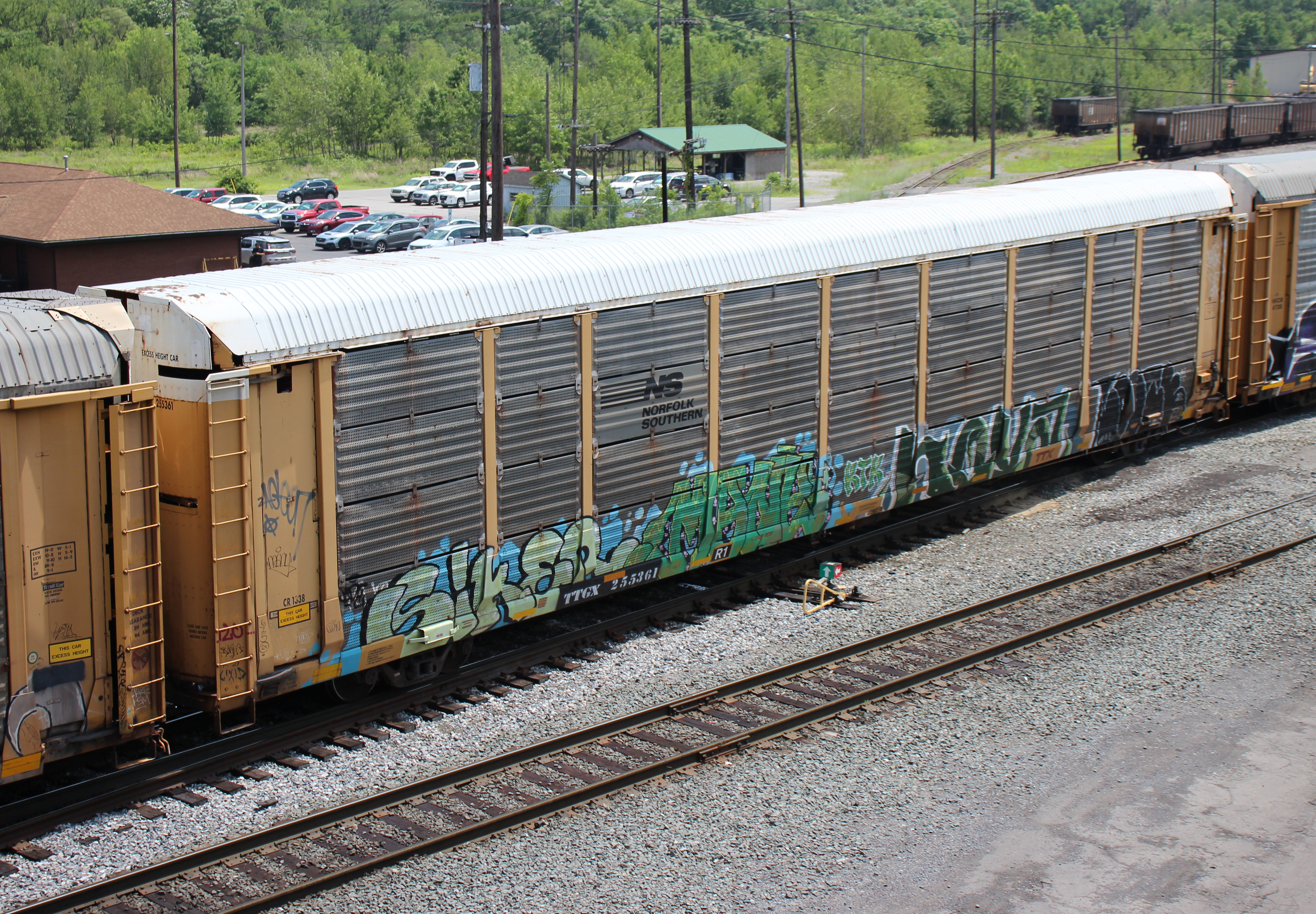 TTGX 255361 is seen in the consist of NS 18N at Altoona, PA on 6/29/25. Rack number is CR 1338 and was built as a CR ML2F class rack in 7-86. It was then rebuilt and repainted NS 4-04 by TRA-L. Rack is now classed FB543 by NS.