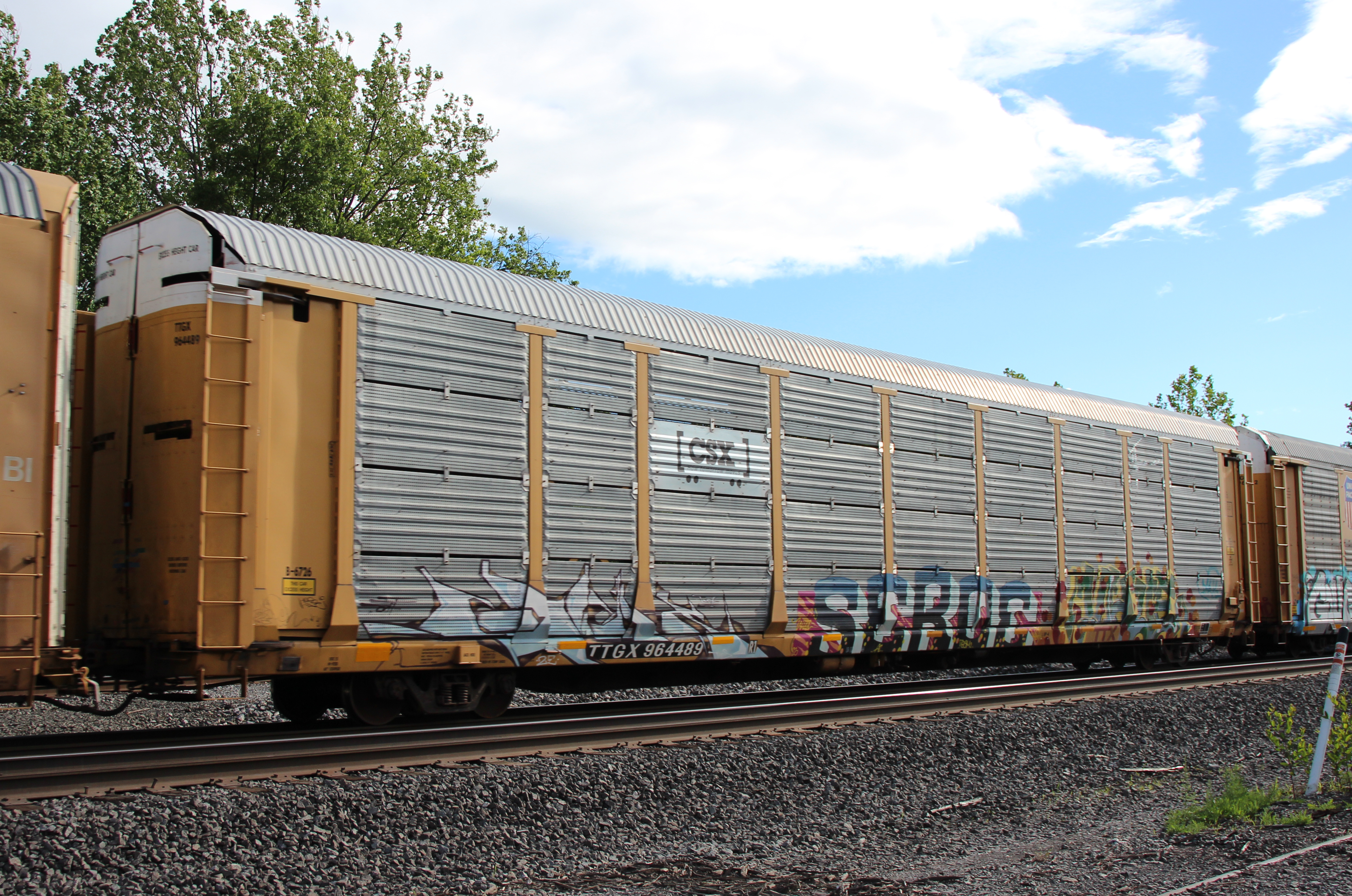 TTGX 964489 is seen in the consist of NS 11N at Sinking Spring, PA on 5/24/25. Rack was built as CR 6726, a CR ML2K class rack, in 6-88. It was then rebuilt, repainted, and renumbered to CSX B-6726 in 2-21 by MEI. I have now photographed this rack in both CR & CSX paint.